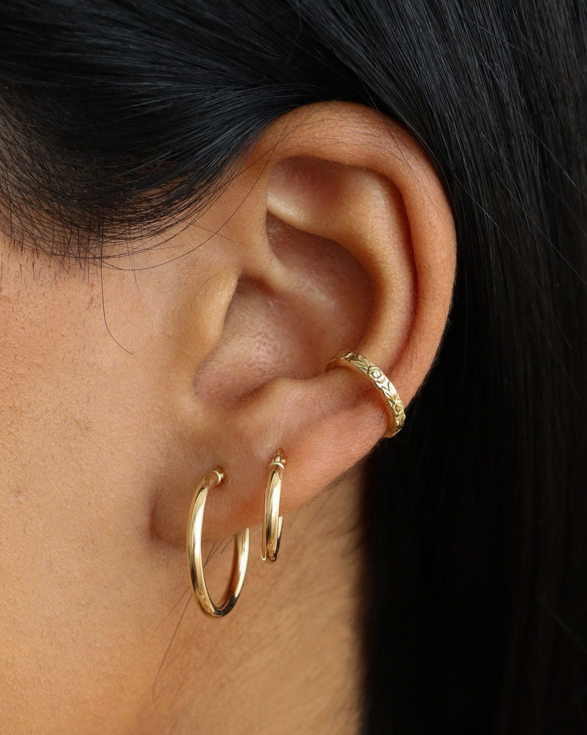 Ear Cuff: Ear cuffs are half circle ear accessories that can be slotted onto the edge of your ear without the need for passing through a piercing. They are designed to be worn in the middle part of the ear where there is a deeper ridge for the piece to be secured.